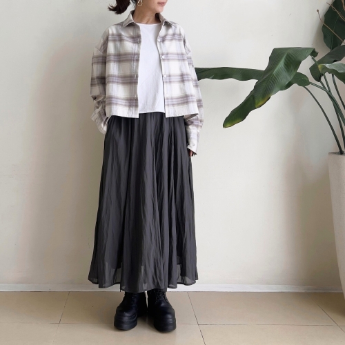 シンプルなショート丈のボタンブラウスです。 甘すぎない大人色 【 オフホワイトX淡いラベンダーXベージュ 】の タータンチェック柄で着やすいです。 短すぎず、長すぎずのちょうど良い大人ショート丈で スカートにもパンツにもバランス良く似合います。 袖のカフス部分を長く取ったデザインがポイントになっています。 一折して着ていただいても素敵です。 肩落ちのデザインでゆったりめのサイズ感。 カジュアルに襟元をやや後ろに下げてルーズに着てもオシャレ感が出るかな、 と思います。 軽い羽織りとしても良く、季節の変わり目などに1枚あると便利に着回して いただけるようなブラウスです。
